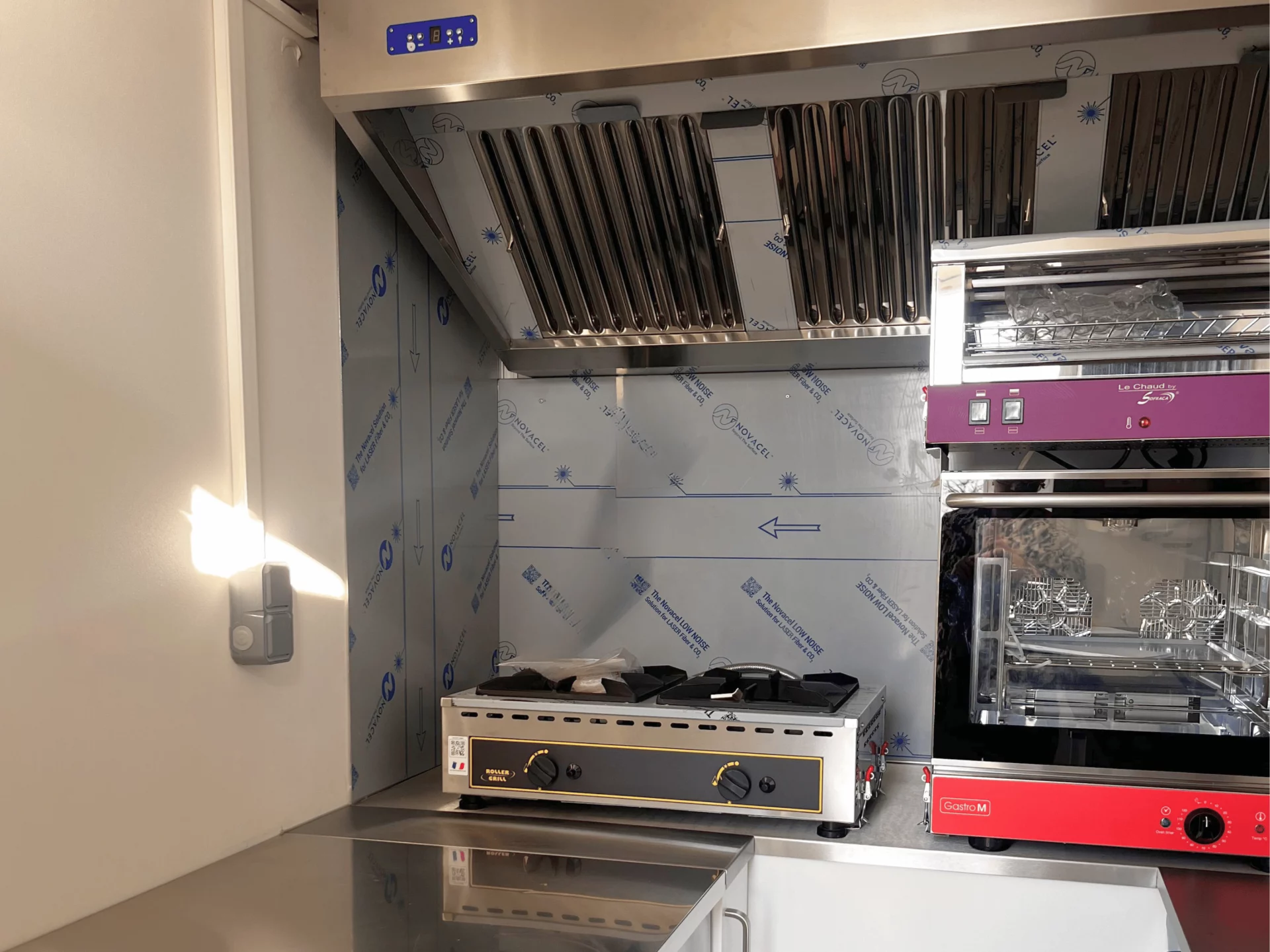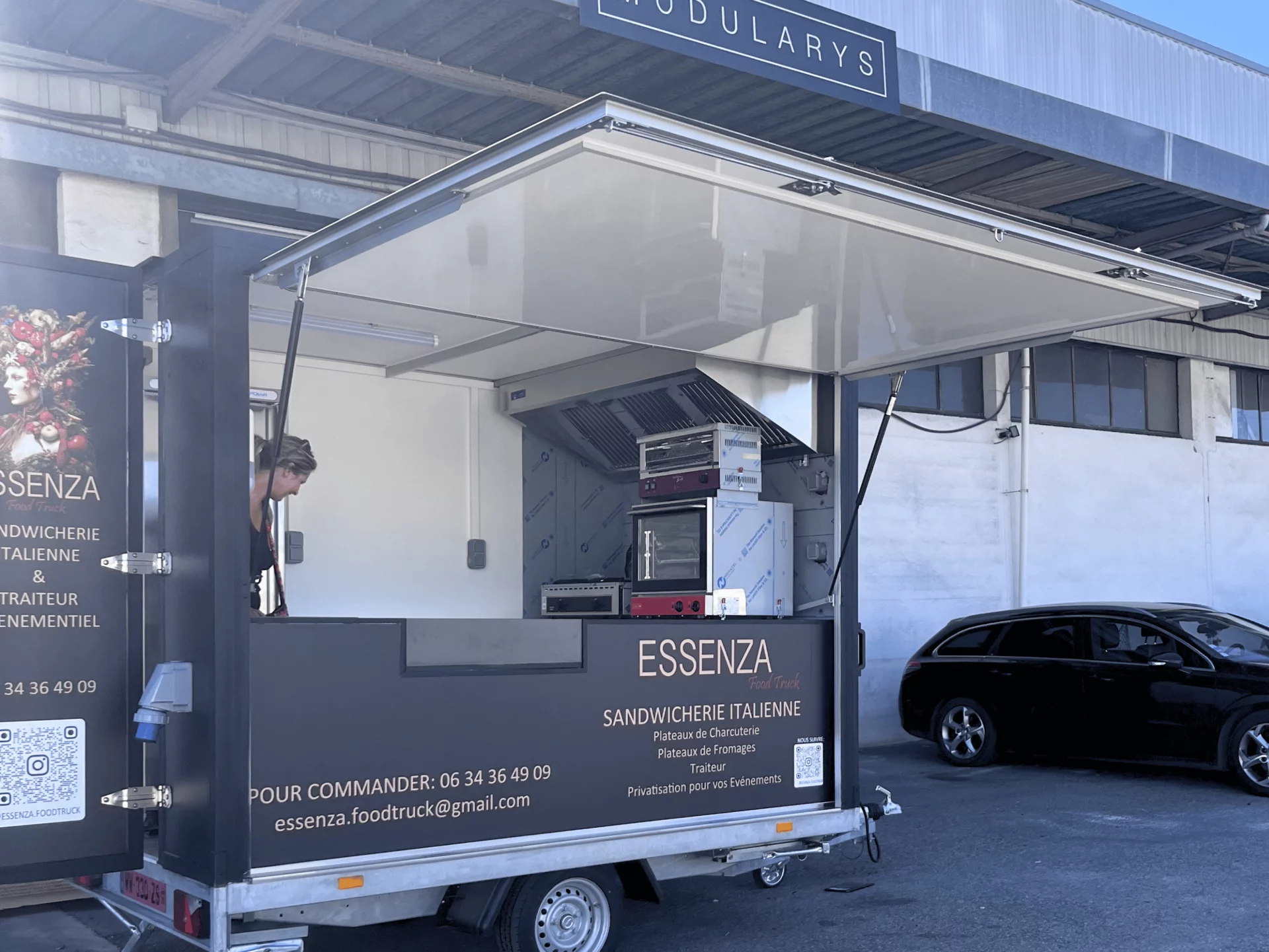 - Remorque food truck traiteur, foodtruck aménagement avec hotte, four, grill, rangement, comptoir de vente