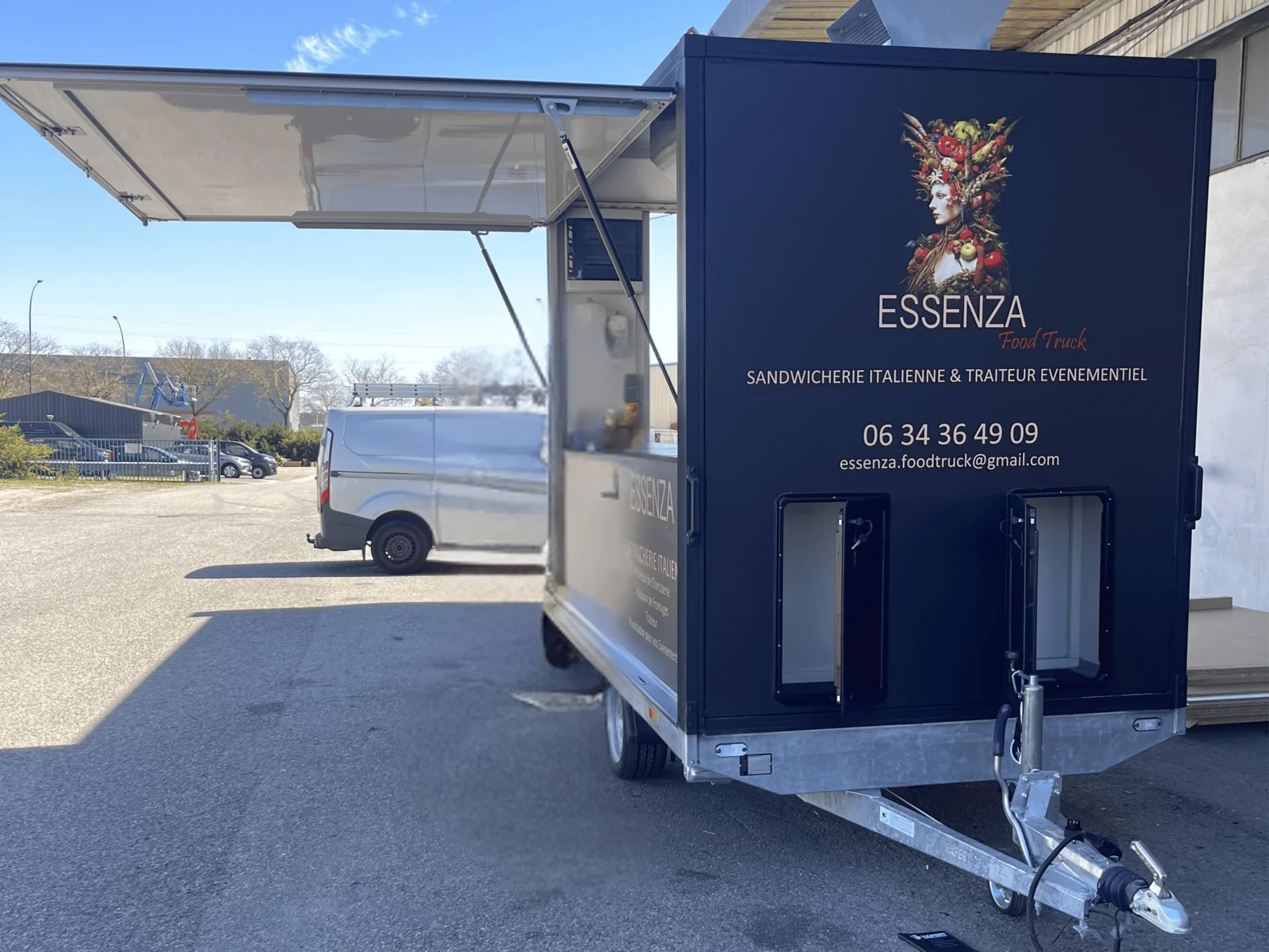 - Remorque 4m de long pour la restauration, normes d’hygiène et de sécurité avec un auvent à l’avant, portes, timons et un essieu